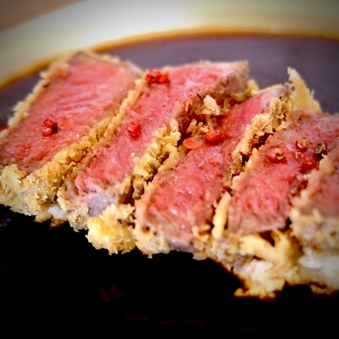 最上級A5ランクの長崎牛をレアに揚げたカツは見た目も味も抜群!自家製ソースと一緒にお召し上がりください