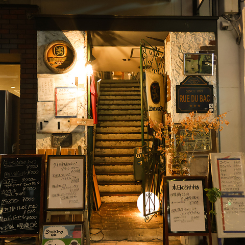 温かみのあるレンガと白い壁が特徴的で、親しみやすい雰囲気を醸し出しています。入り口は、緑のアイアンゲートや階段などが隠れ家的な雰囲気を漂わせます。特に写真入りのメニュー看板などが通行人の目を引きやすくなっております。店先にはランチセットやイベント情報が掲示されており訪れる人々に当店の魅力を伝えてます
