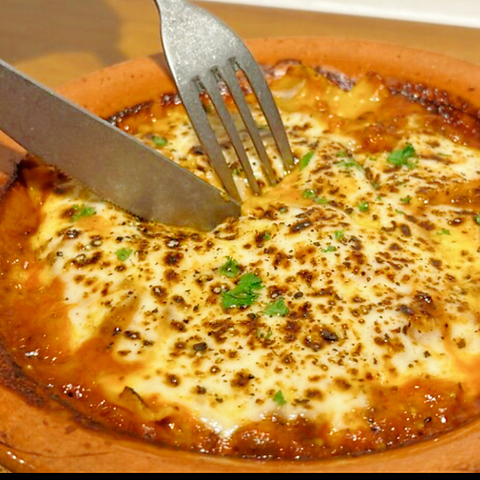 迷ったら食べてほしい人気メニュー「ラザニア~スパイシーサルサヴェルデ~」。国産牛がごろごろ入った濃厚ミートソースに、とろけるチーズを重ねた贅沢な味わいです。自家製スパイシーバジルサルサは“ハリッサ”とバジルを合わせ、奥深い辛味が全体を引き立てます。熱々のラザニアはワインとも相性抜群で、虜になること間違いなし。