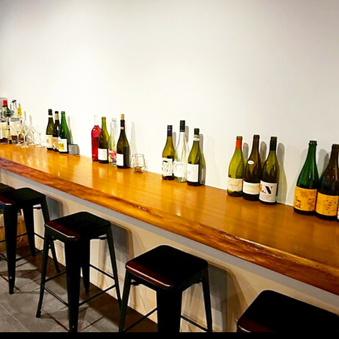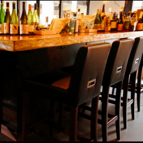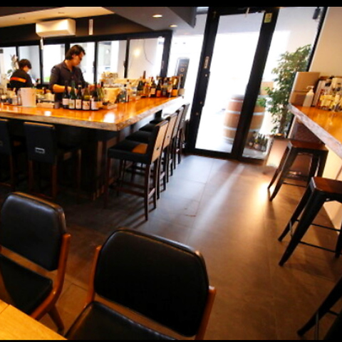 ガラス張りで明るく開放的な店内は、海外のバルを思わせるお洒落な雰囲気。シックなインテリアが落ち着きを演出し、カジュアルな食事にも最適です。一枚板のカウンター席では調理を間近に眺められるライブ感も楽しめます。ペット同伴OKのテラス席もあり、グループ利用から一人でも気軽に過ごせる居心地の良い空間です。