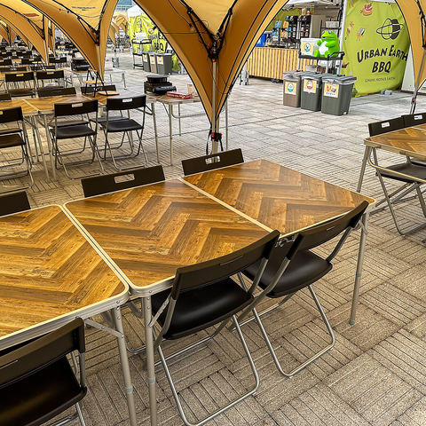 全天候型BBQ場として、日差しや雨よけのテントを設置!雨の日も楽しめるバーベキュー&ビアガーデン会場でいつでもBBQ!