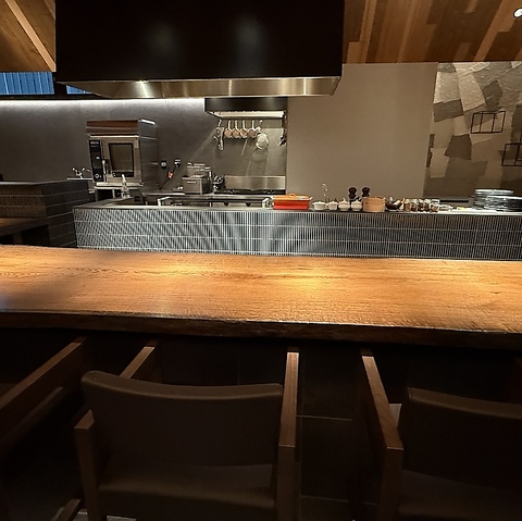 炉端スタイルのオープンキッチン調理されていく様を感じながら次の料理が楽しみになる
