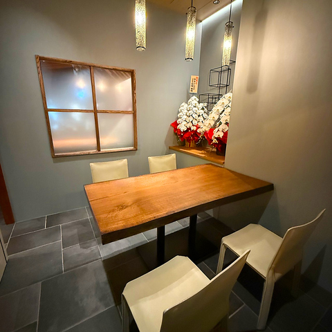 ≪プライベート個室≫4名様用の個室もございます。落ち着きのある洗練されたデザインで統一され、忙しい日常を忘れさせるような、落ち着いた雰囲気が漂っています。心地よい空間で、心ゆくまで料理を味わい、リラックスした時間をお楽しみください。