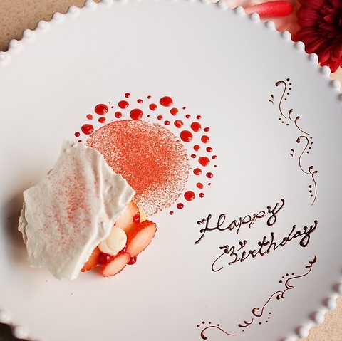 お誕生日・記念日などのお祝いのシーンには、記憶に残る素敵な時間をご提供いたします。ご予約の際に記念日コースをご利用いただくと、サプライズプレートをお出しします☆最幸のひと時をお過ごしください。