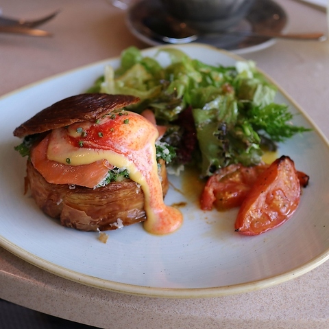64層に重ねた生地が生み出す、ザクザクの食感が特徴。中はふんわり柔らかく、北海道バターの香りがたっぷり広がります。具材には、ノルウェー産のサーモンとアボカドを贅沢に使用。アクセントにケールのほろ苦さをプラスし、コクのある卵黄たっぷりのオランデーズソースでまとめました。