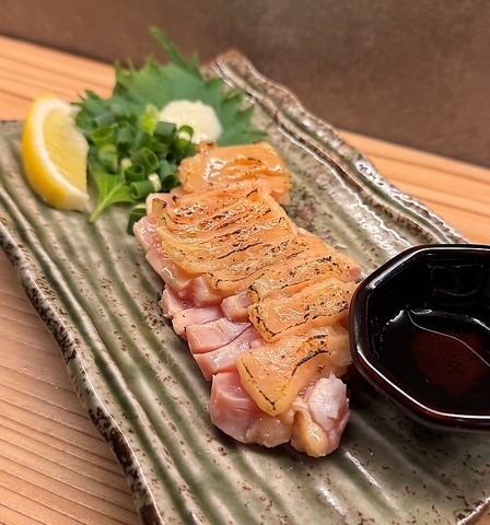 鶏のたたきは絶品の一品。こだわりの天日塩を使用。だしポン酢やにんにく、しょうがなどと合わせてどうぞ!