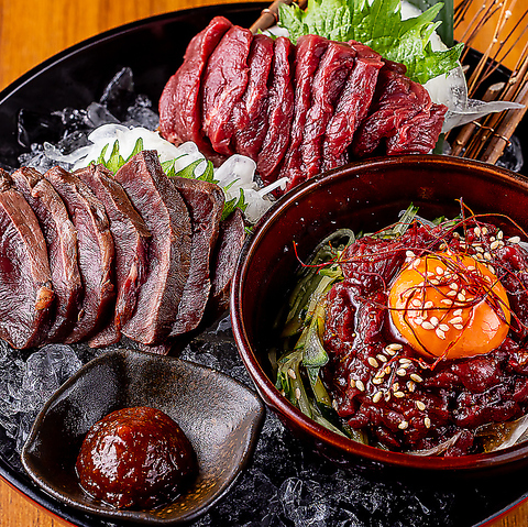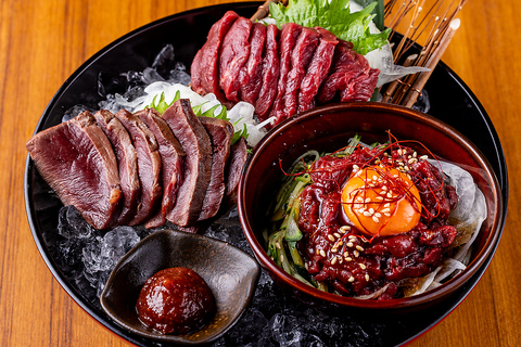 刺身・ユッケ・ハツ炙り刺しを豪勢に一皿に盛りました!
