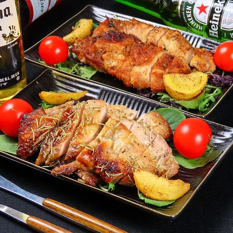 当店の看板メニュー「ロティサリーチキン」は、お1人様でも召し上がっていただけるように、部位でのご提供もいたしております。、