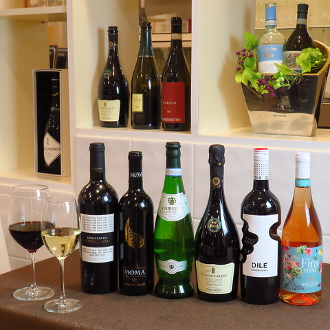 とっちんでは、イタリア各地から厳選した40種類以上のワインをご用意。赤・白・スパークリングまで幅広く取り揃え、料理とのペアリングもお楽しみいただけます。ワイン初心者の方にもスタッフが丁寧にご提案いたしますので、お気軽にご相談ください。