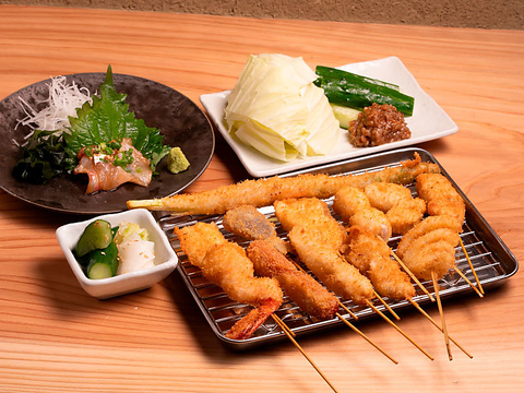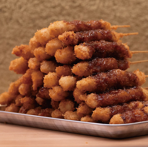 お肉、海鮮、野菜、デザート串などバラエティ豊かな串が30種類上楽しめる串カツメニュー。サクサク食感がクセになります。中でも奥豊後豚と大分ハーブ鶏の「お得串」はとにかくお得。