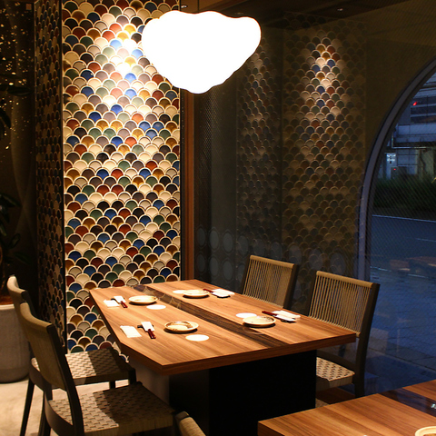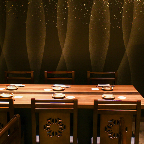 半個室風なテーブル席もござます。黒を貴重とした内装で、片側ベンチシートタイプのお席。4名テーブル2卓横並びで、8名様でのご利用だと両サイドも区切られ周囲をあまり気にすることなく、お食事や会話に集中いただけます。