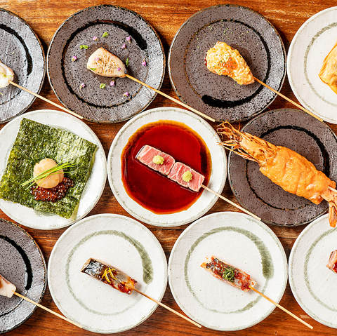 ソースやオリジナルの味付けで提供する魚串が自慢です!大阪の市場から鮮魚を仕入れ、店舗で捌きたてを串うちしております。中でも一押しなのが「鳥取県産琴浦グランサーモン」◎独自に“漬け締め”調理したお造りや、お寿司、魚を使った各種一品料理もぜひご堪能くださいませ!