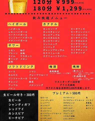 | お酒 | カクテル充実、焼酎充実、日本酒充実、ワイン充実 |