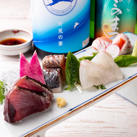 市場直送の厳選された旬の海の幸をご用意しております。赤身・白身・青身をバランス良く、4~6種の中から3種(2切れ)をご提供しますので、美味しくお召し上がりいただけます。丁寧に刃を入れ、その日に1番良い状態の鮮魚を3種類、お好みのお酒と共にじっくりとご堪能ください。人数に合わせて調節も承ります。