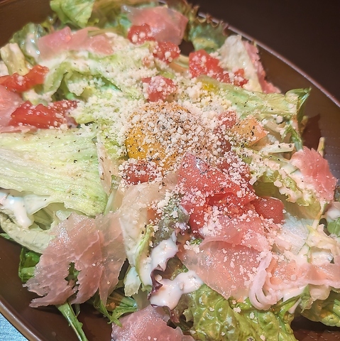 生ハム×チーズの定番の組み合わせに温泉たまごをのせたクリーミーサラダ♪