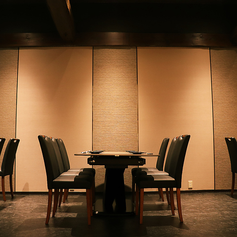 テーブル席は、落ち着いたトーンのインテリアでまとめられたプライベート感あふれる空間です。柔らかな照明が心地よい雰囲気を演出し、ご友人やご家族との会話を楽しむのに最適です。シンプルで洗練されたデザインが、特別なひとときをより一層引き立てます。大切な方との思い出に残る食事をお楽しみくださいませ♪