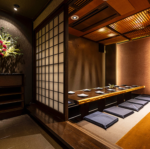 当店では、個室席をご用意し、プライベート感を大切にした空間を提供しております。インテリアには、和の伝統美を反映させた素材やデザインを採用し、落ち着いた色合いと温かみのある木材を使用しております。随所に施された細やかな装飾や照明が心地よい雰囲気を醸し出し、特別なひとときを演出いたします。接待や記念日などの特別な日にも◎