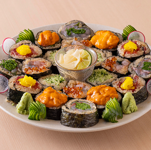おすすめの巻き寿司を大皿に盛り付けます。巻き寿司花盛りは、色とりどりの具材をふんだんに使用した一皿。新鮮な魚介や旬の野菜がぎっしり詰まっており、見た目も華やか。口に運ぶと、素材の旨みと風味が広がり、食欲をそそります。特製のわさびやガリ、レモンを添えて、さらに味わい深い、彩豊かな一品に仕上げています。