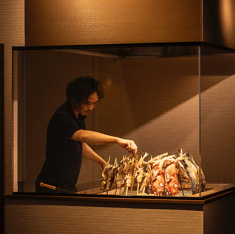 暖簾をくぐると目の前には日本古来の調理方法【原始焼き】の炉端。じっくりと焼上げる当店自慢の逸品です。