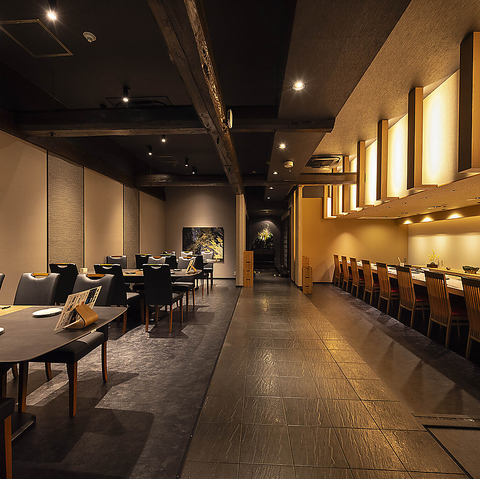 カウンター席は、落ち着いた照明に包まれた洗練された空間です。職人の技を目の前で楽しめる特別な席で、臨場感あふれる料理の様子が魅力♪木の温もりとシンプルなデザインが心地よい雰囲気を醸し出し、リラックスしたひとときをお過ごしいただけます。おひとり様はもちろん、大切な方との特別なお食事にもぴったりです。