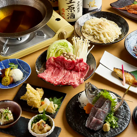 旬の味覚と贅沢食材を盛り込んだ全9品の特別コース。目にも華やかな鯵の姿造りや旨みが詰まった酔っ払い海老、黄金色に揚げたアジフライなど、海の恵みを存分に堪能。さらに黄金出汁で味わう高座豚しゃぶしゃぶや、〆にぴったりな稲庭うどん、本日のデザートまで、心ゆくまでお楽しみいただけます。