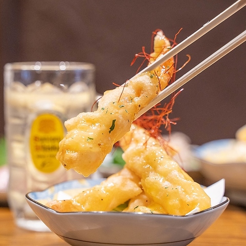 ぷりぷりの大海老は包丁で切れ目をいれ下処理した後に、高温でサクサクに揚げています。 天ぷら粉は水ではなく強炭酸水を使用しているため、表面がサクサクに仕上がります!ソースは自家製からしマヨソース!リピーターも大変多いです!
