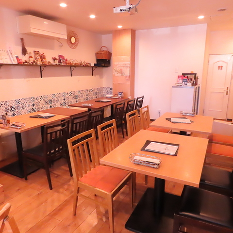 少人数から団体様まで。レイアウト自由なテーブル席。おしゃれな幾何学模様のタイルが映える、明るく清潔感のあるお席。お食事の規模に合わせてテーブルを繋げることができ、10名~20名様といった中規模の宴会にも柔軟に対応いたします。女子会やママ友会にも人気です。