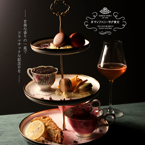 映画のワンシーンのような心地よいモダンクラシック空間で紅茶やハーブ、スパイス香るお料理と共にアフターヌーンティーの余韻をディナータイムに繊細な香りと泡、そして少しの非日常を五感で感じていただけます。