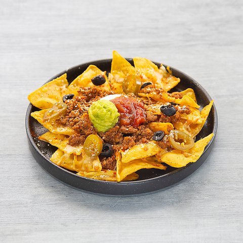 - 【メキシカン】ナチョス(トルティーヤチップスに下記の具材とチーズ、サルサをトッピング)