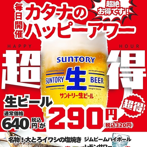 毎日OPENから18:30までハッピーアワーを開催中!生ビールが驚きの特別価格に。ジムビームハイボールや翠ジンソーダも、大変お得にお楽しみいただけます。さらに、名物「大とろイワシ塩焼き」も衝撃の価格でご提供!土日祝は早くからOKなので昼飲みにも、宴会前の0次会にも最適です。
