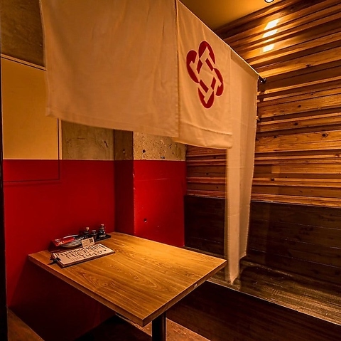 【テーブル席(半個室):2~8名様】周りを気にせず楽しめる、テーブル席の半個室(4名様席を2卓ご用意)。2名様から最大8名様までご利用可能です。入り口の暖簾(のれん)をくぐれば、木の温もりと赤い差し色が印象的な和空間が広がります。ご友人との語らいや少人数の宴会にぴったりです。