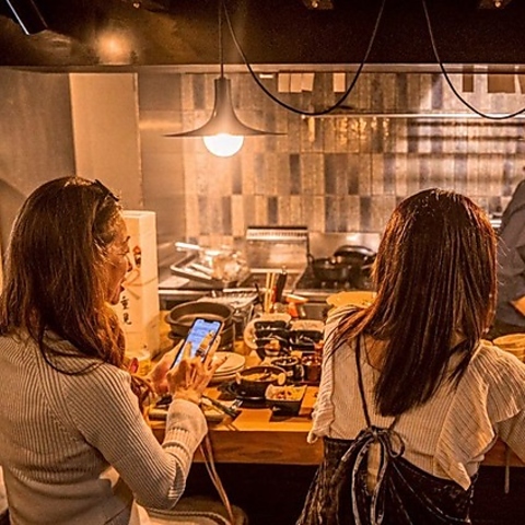 店の中央には焼き台があり、炉端焼きのパフォーマンスを目の前で楽しめます。職人の手さばきや香ばしい香りが食欲をそそる、ライブ感満点の特等席。友人同士でのご来店はもちろん、デートにもこちらのカウンター席がオススメです。キッチンの活気を感じながら、素敵なひとときをお過ごしください。
