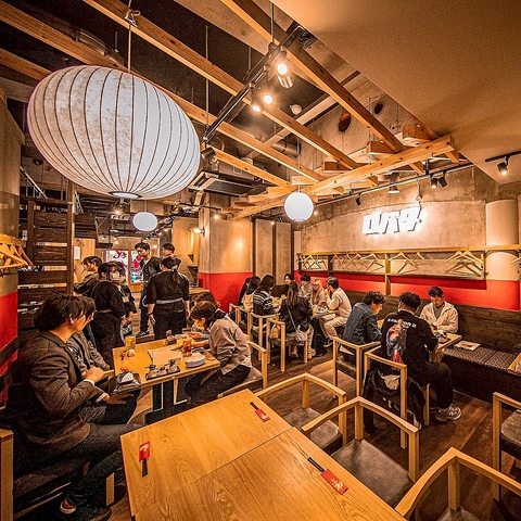 【テーブル席:2~36名様】4名様~6名様のテーブル席を複数ご用意。横並びのレイアウトはご宴会もしやすく、一体感が生まれます。奥の席はすべて使い、最大35名前後での半貸切にも対応可能。周りを気にせず、会社の飲み会やご友人との集まりで盛り上がれる、木のぬくもりが心地よい空間です。