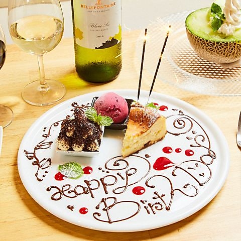 アニバーサリープレート承ります!記念日のお祝いや宴会コースのサプライズにご利用ください。メッセージ入れも対応可能です。コースご利用の方向けにお得なクーポンもご用意しております。