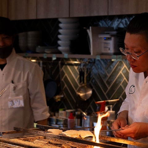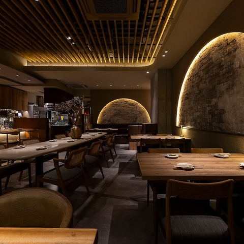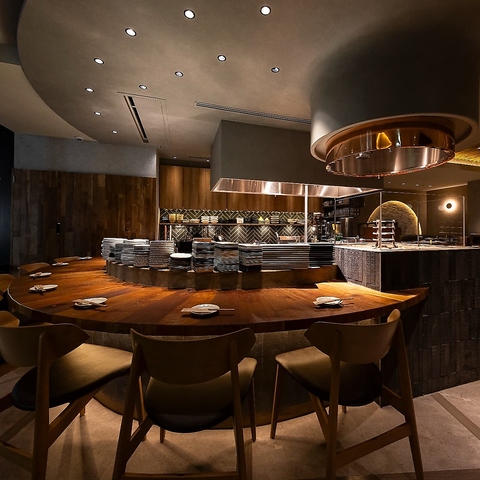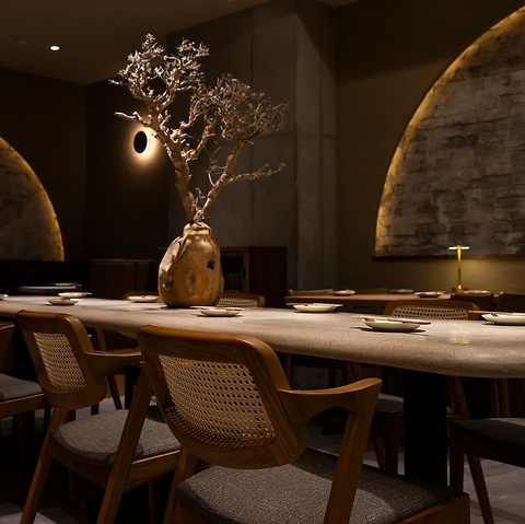 【デート・接待】適度に暗く雰囲気抜群な店内は上質な空間でお客様を非日常空間へ誘います。テーブル席は温かみのある木を使用し、囲炉裏、藁焼きなどで迫力満載のカウンター席はまさにライブ席。五感で楽しむライブキッチンをお楽しみください。