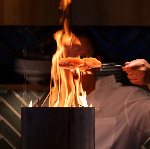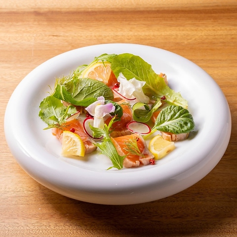 脂ノリがいいノルウェーサーモンを彩り豊かな藁焼きカルパッチョに。藁焼きにすることで、独特の香ばしい香りが特徴です。藁で焼き上げることで、サーモンの旨味を引き立て、燻製のような香りが加わるのが魅力です。