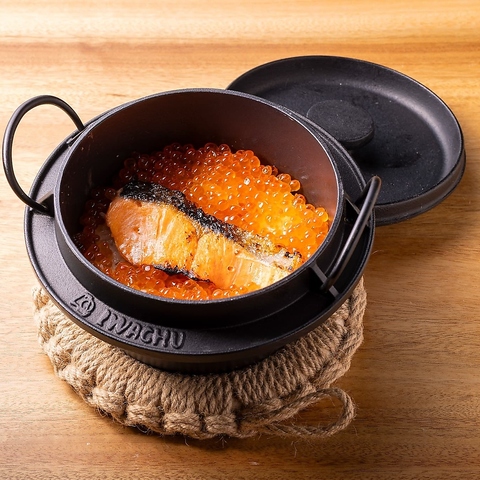 南部鉄器を使用した釜めしです。ここはもうイクラの海!!惜しげもなくイクラを乗せています!!鮭も炭で焼いた焼き鮭を乗せているので、香り味共に抜群!!
