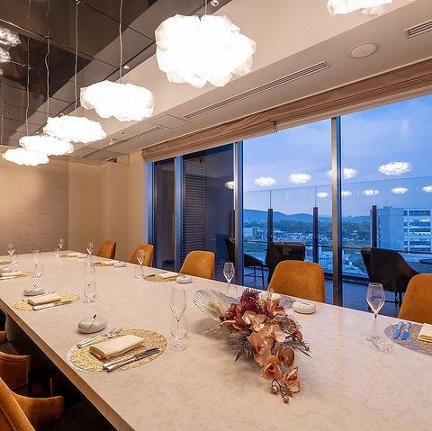 接待やご結納、お祝い事など、様々な用途に合わせてご利用いただける天空のプライベート空間をご用意しています。併設のテラスでは、美しい眺望とオープンエアの爽快感を満喫でき、特別なひとときを演出します。心地よい環境で大切な瞬間をお過ごしください。