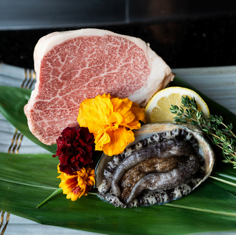 天草産の鮑と黒毛和牛ロース肉をメインにしたコースです。絶妙な火加減でなせる鮑の柔らかさと弾力、黒毛和牛の旨味と甘みなど、県産、九州の食材とあわせてお楽しみください。コースのみ20000円(税込)、4種類のペアリングワイン付コースも26000円(税込)にてご用意しております。※鉄板焼きカウンターでの提供となります。