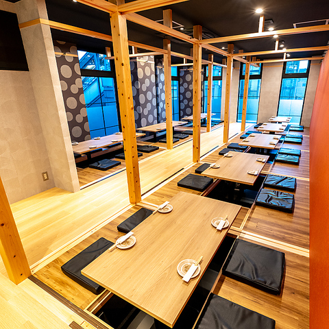 【岡崎駅から徒歩1分】でお集まり楽々。完全個室多数ご用意しております。【2~4名様】【5~8名様】【9~10名様】【11~16名様】【17~20名様】【21~40名様】1F最大54名、2F最大76名様、多彩にお選び頂けます。店内は和モダンな雰囲気で落ち着いてお食事をお楽しみ頂けます。人気の掘りごたつ席を多数ご用意してます。
