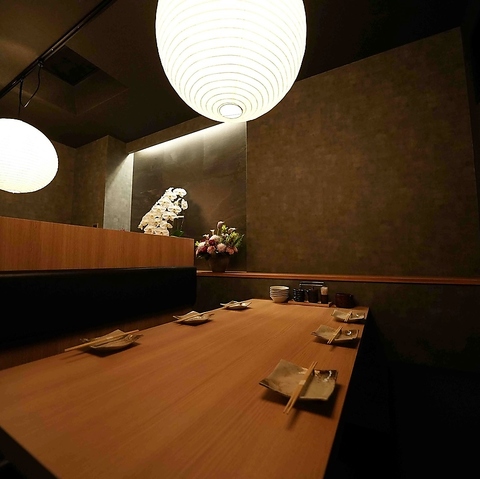 木の温もりと和の設えを基調とした、落ち着いた照明の洗練された空間。「大人の隠れ家」のような雰囲気は、デートや会食に最適とご好評です。ゆったりと上質な時間をお過ごしください。