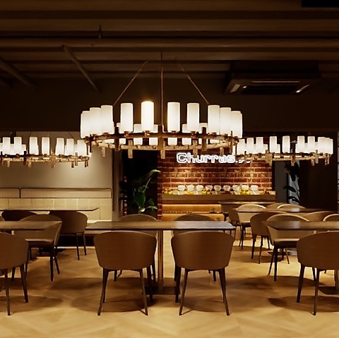 非日常感を演出する、洗練された空間。 都会的でモダンな店内に、シックなブラウンのソファとベージュのチェアを配置。照明の温かみが心地よい、落ち着いた雰囲気です。友人との食事からデートまで、幅広いシーンで本格シュラスコをお楽しみいただけます。