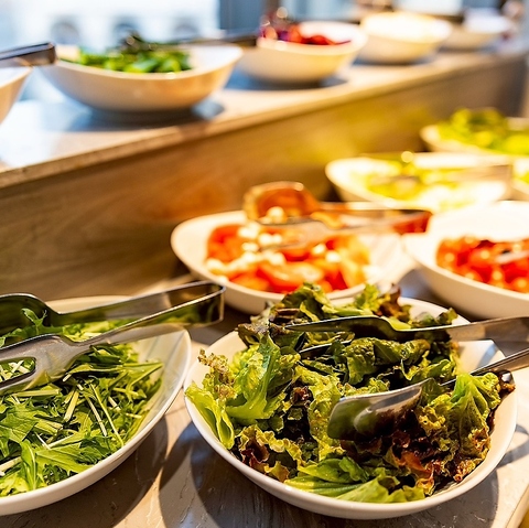 ◆ 毎日仕入れる新鮮野菜: 旬のリーフ野菜や、ベビーコーン、トマト、オクラなど、色とりどりの野菜を常時20種類以上ご用意。目の覚めるような新鮮さを味わってください。◆ ドレッシングも豊富: 自家製ドレッシングから定番の和風・洋風ドレッシングまで、お好みに合わせてカスタマイズOK!