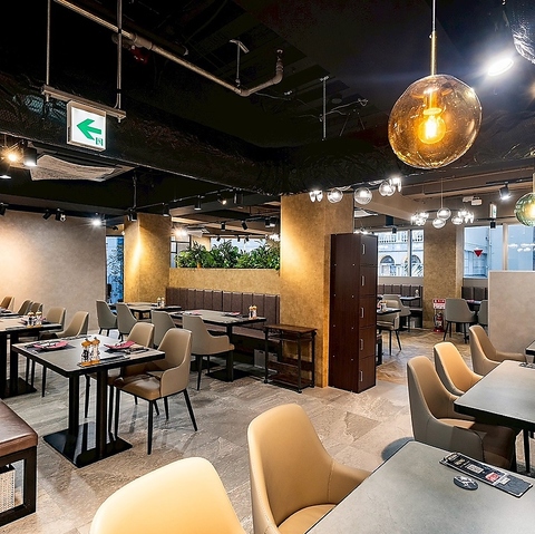 ゆったりとくつろいで頂ける、モダンでカジュアルな空間♪会社帰りのちょい飲みにもピッタリのテーブル席です☆シックな照明でムード満点。隠れ家のような空間。 フロアの奥には、デートや少人数での利用に最適な、落ち着いたエリアもございます。遊び心のある球状の照明が空間にアクセントをプラス