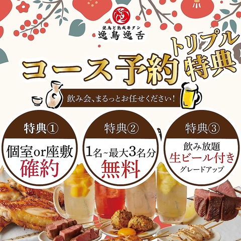コース予約で3大特典[1]個室確約[2]6名以上で幹事1名無料[3]飲み放題グレードアップ※詳細はクーポン欄へ!