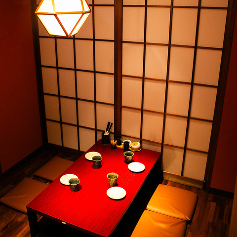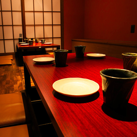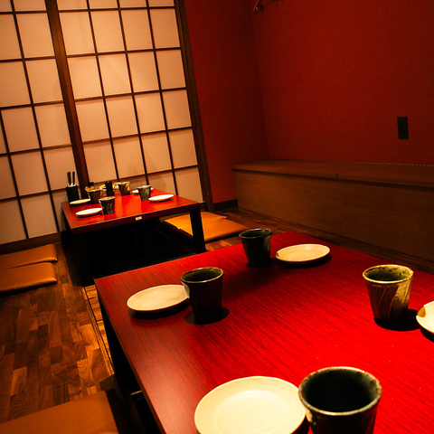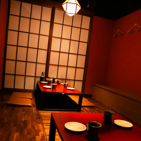 4名様から最大14名様までご利用いただける掘りごたつ個室を完備。赤を基調とした落ち着いた雰囲気の店内で、ゆったりとしたひとときをお過ごしいただけます