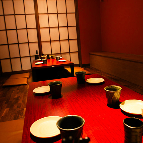 4名様から最大14名様までご利用いただける掘りごたつ個室を完備。赤を基調とした落ち着いた雰囲気の店内で、ゆったりとしたひとときをお過ごしいただけます