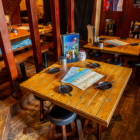 木製のテーブルと丸椅子が特徴の団体様向けお席。温かみのある木の内装が落ち着いた雰囲気を演出してくれます。ゆったりとお話を楽しめるようなテーブルの設計になっているため、お友達や会社の飲み会などでも最適。テーブルの配置も自由にできるため、人数様に合わせてご案内します!
