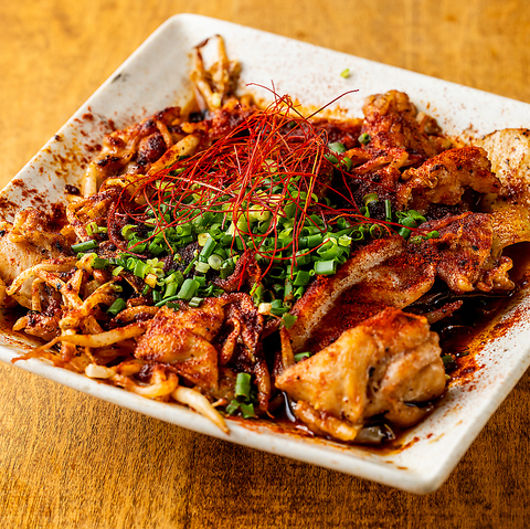 「激辛!!鶏の島ラー油炒め」は、ジューシーな鶏肉を島唐辛子入りの特製ラー油で豪快に炒めたピリ辛料理です。沖縄の風味豊かな辛味が口いっぱいに広がり、辛党にはたまらない一品。ご飯やお酒との相性も抜群です。