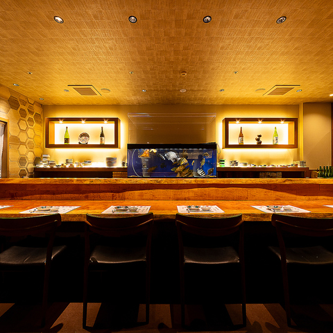 | カウンター | 1名様×6 | 【生簀前カウンター/1~2名様】木を基調にした和モダンのしつらえに、大型の生簀とオープンカウンターを組み合わせた店内は、博多駅前にありながら“港町の臨場感”が漂います。カウンター席では、目の前で活魚を捌く職人技と生簀の魚影を同時に眺められるライブ感あふれる食体験が魅力です。 |
